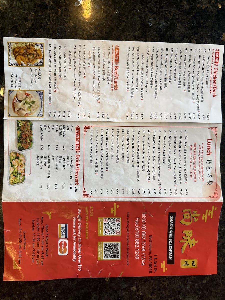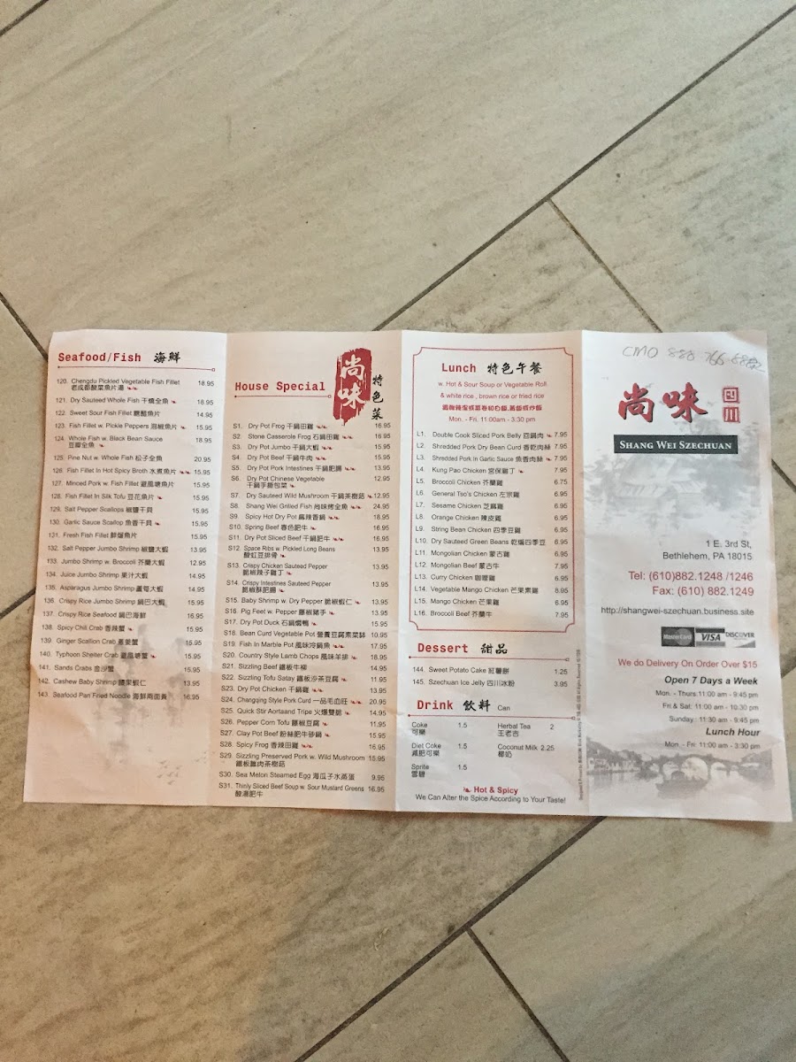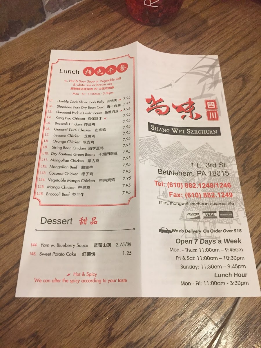 At Shangwei Szechuan 尚味四川, you'll discover a true taste of Szechuan cuisine right in the heart of Bethlehem. Located at 1 E 3rd St, this vibrant restaurant brings bold and flavorful dishes inspired by the famous Szechuan region of China. Whether you're craving a fiery plate of kung pao chicken or something a bit milder like their savory mapo tofu, there's something for every taste. The menu is thoughtfully crafted, combining traditional spices with fresh ingredients to create authentic flavors. Don't miss out on their signature dishes, from sizzling hot pots to the perfect balance of sweet, salty, and spicy stir-fries. Every meal here is a celebration of Szechuan flavors, bringing the heat and excitement straight to your table.